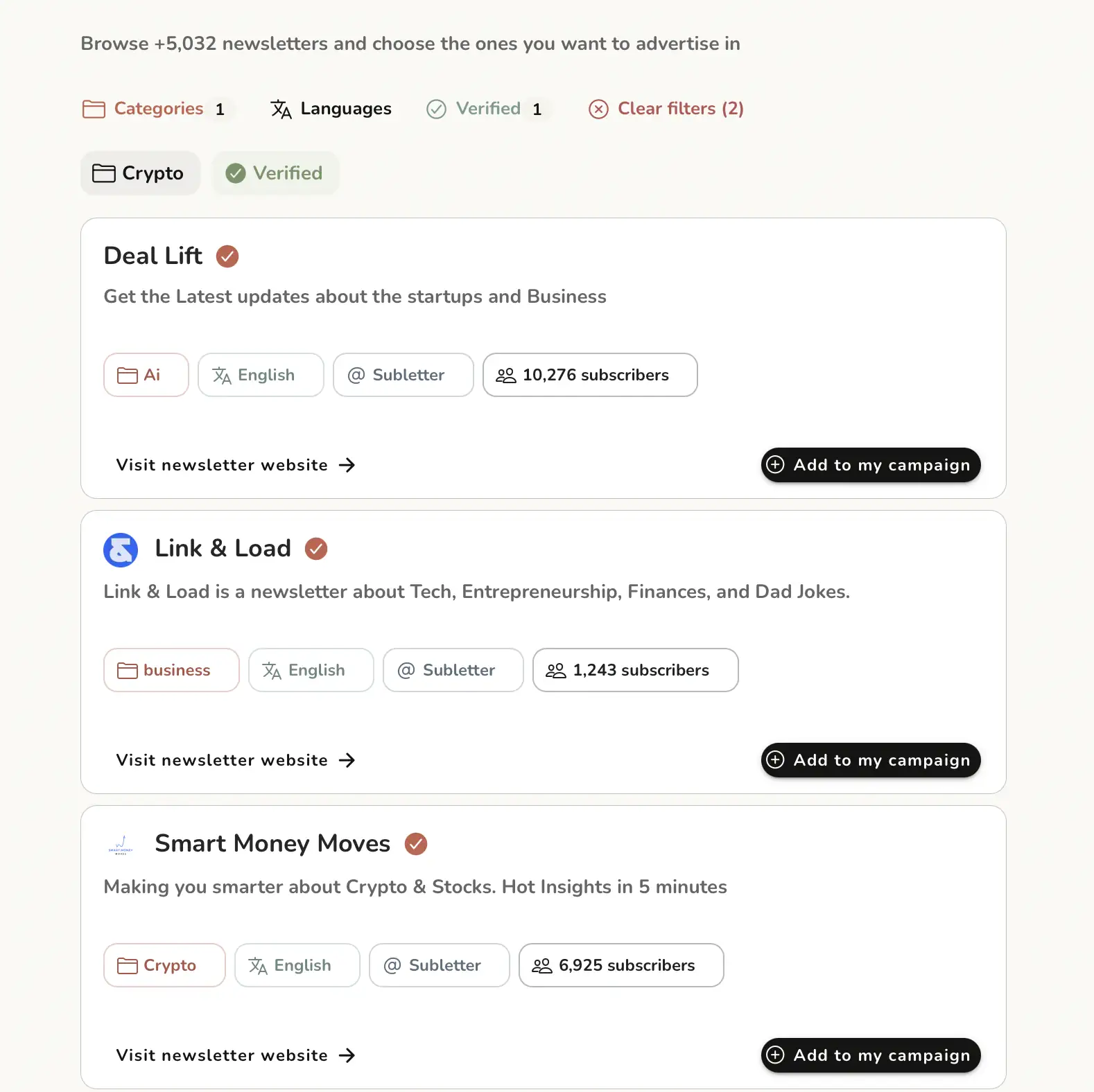 Select newsletters by filtering through languages and categories — your ad will only be displayed in those newsletters, targeting reader segments that best match your audience.
