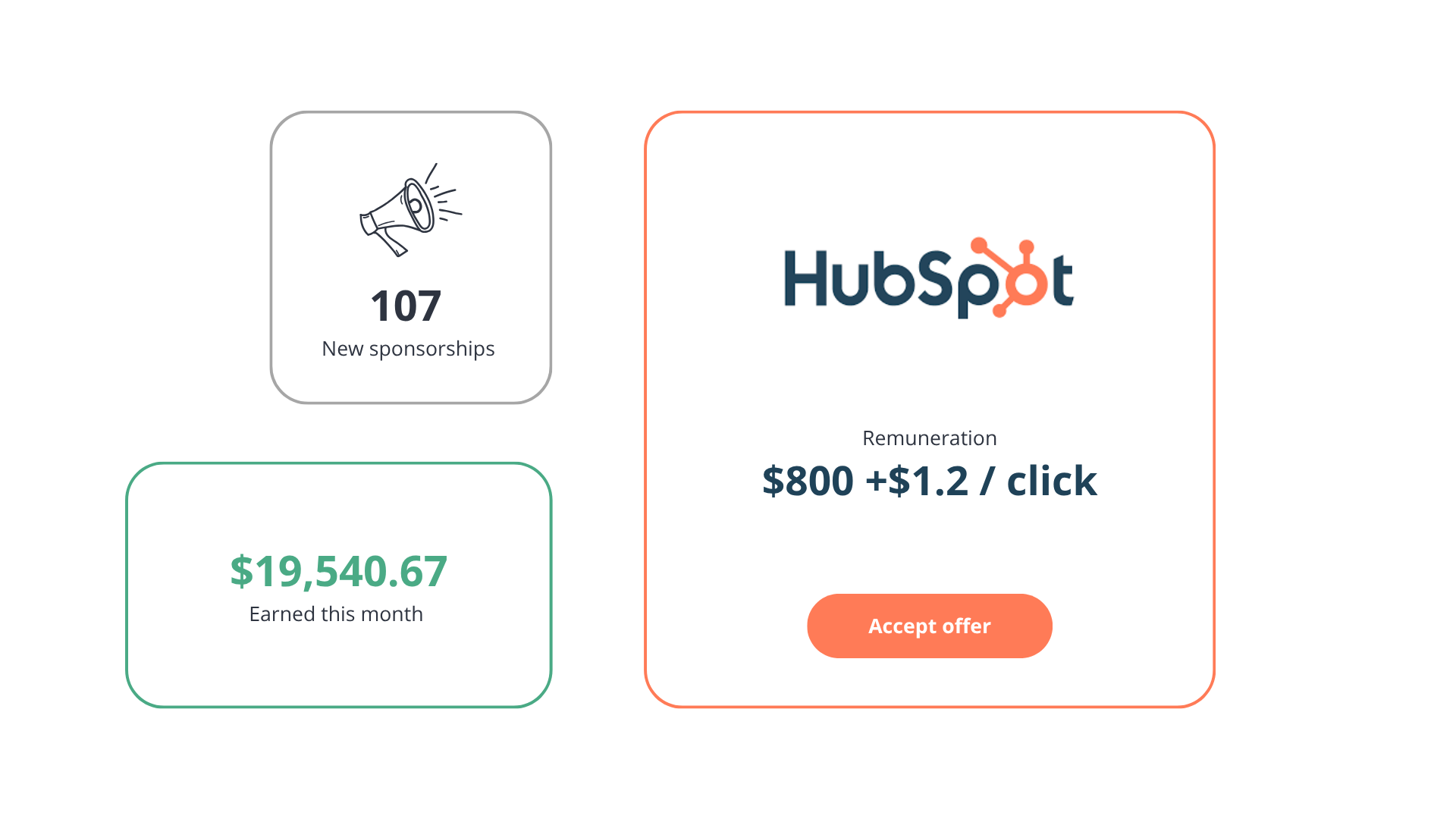 When you accept an offer, you can write and send one or multiple emails through our platform. The sponsored ad is automatically included at the bottom of your email. From your dashboard, you can track your revenue in real time and get paid for every email you send via Stripe Connect.